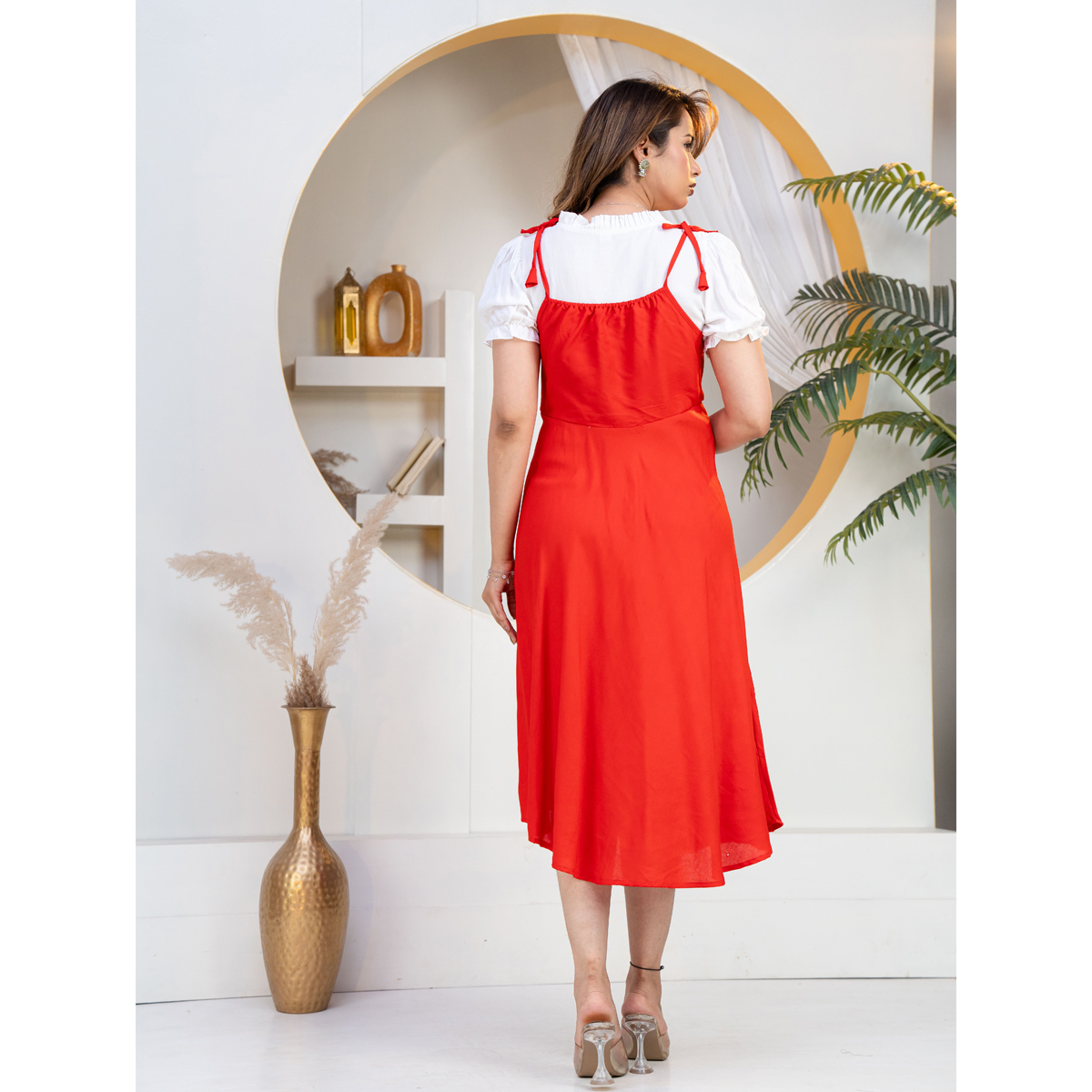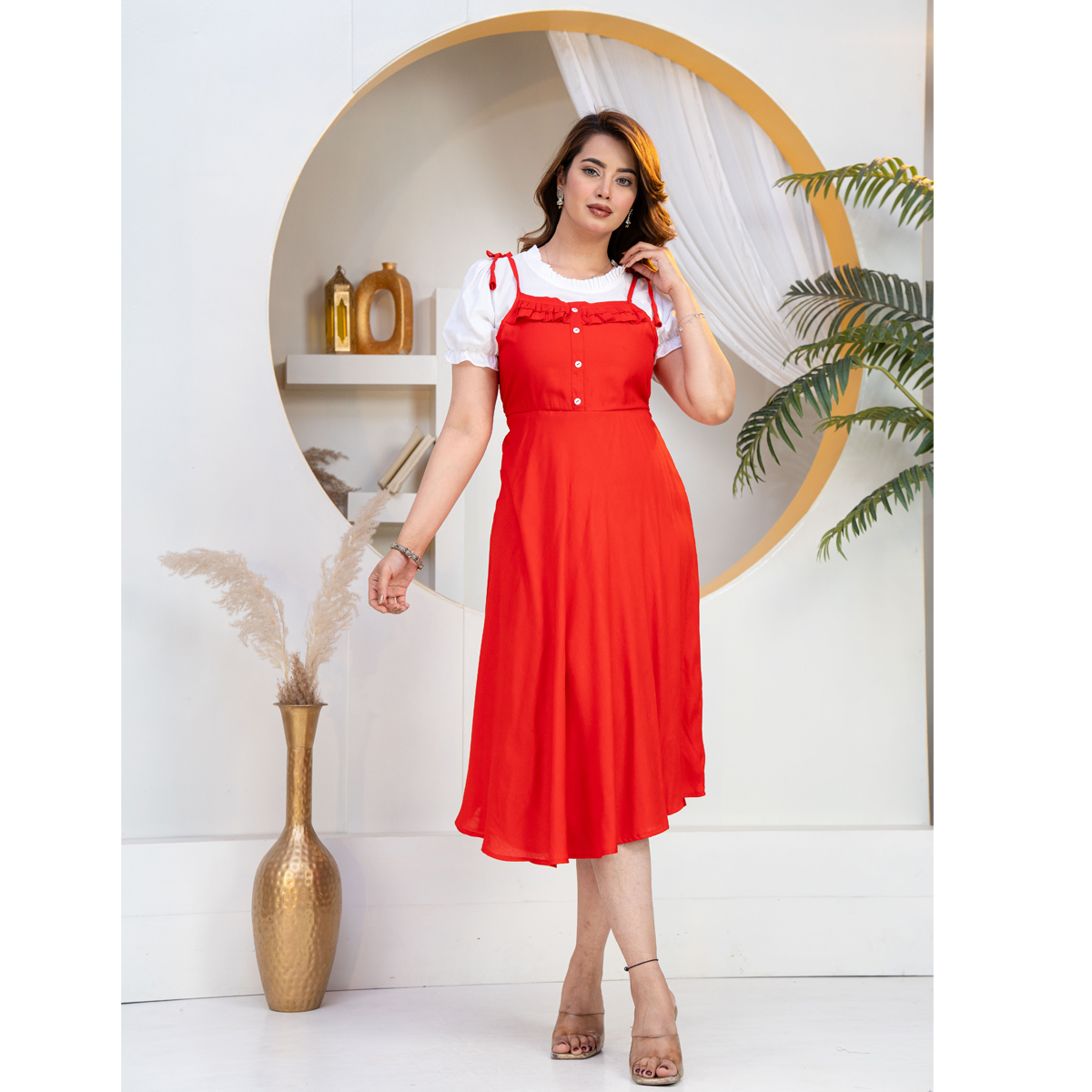 A stylish red dungaree dress is the perfect blend of playful charm and modern fashion. Designed to offer both comfort and trendiness, this outfit features a flattering fit-and-flare silhouette that enhances your overall look while keeping it relaxed and easy to wear.